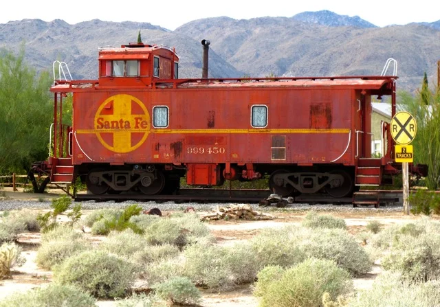 I attended the Borrego Springs Desert Gardeners meeting last week. This is a loosely organized group of desert dwellers who are interested in using native plants that are low-maintenance and are adapted to the arid desert climate. The meeting was held at the home gardeners that included some unusual yard art into their garden. This object was "Fe", their name for the full-size Santa Fe caboose they've incorporated into their garden. Their house is just out of the picture to the left.