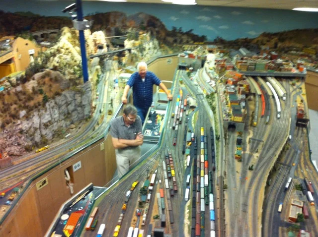 Bryan Hunnell and Pat Keegan operate the main Vista freight yard and West End yard (bottom) to keep trains moving on the Highland Pacific Railroad.