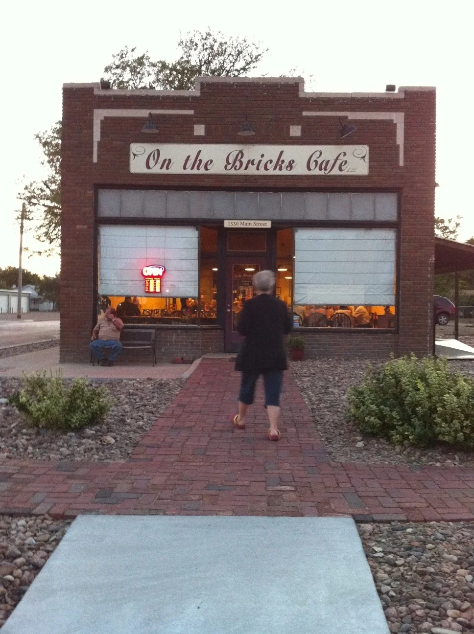 One of the principles we try to follow on vacation is to not eat any any "chain" style eatery (McDonalds, Applebes, Dennys, etc.). We seek out the local places … like small town cafes. This one, the On The Bricks Cafe on Goodlad, Kansas, we found on Yelp (http://www.yelp.com) and it had a number of good recommendations form previous diners. A nicely restored old building and terrific hand-breaded chicken fried steak made for a great meal. The homemade apple cranberry crunch pie was good too!
