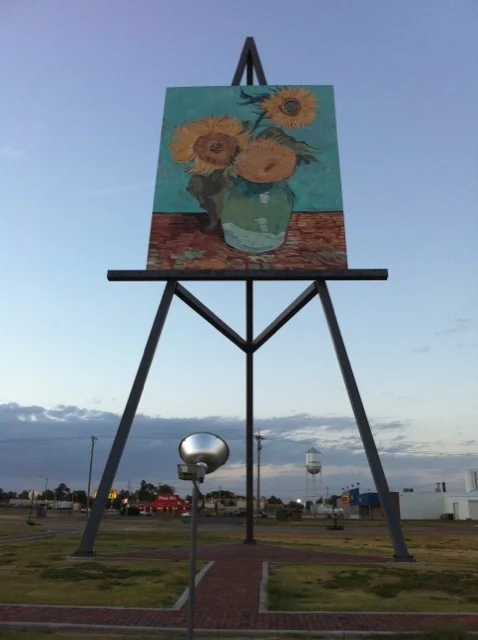 This reproduction of a famous Van Gough painting is 24 x 32 ft. And sits on the world's tallest easel in Goodland, Kansas. It is one of seven by a Canadian artist, one painting has been placed on each of the seven continents.