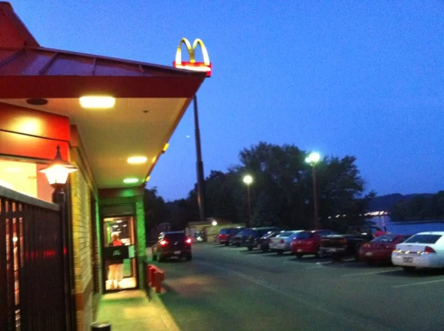 Earlier this evening we stopped at the McDonalds in Pomeroy, OH on the bank of the mighty Ohio River. While browsing the menu we spied pizza on the menu--pizza along with 10 piece McNuggets. They also had scooped ice cream cones in addition to soft serve. Best of all? Actual paper towels in the restroom. None of those hot air machines for Pomeroy.
