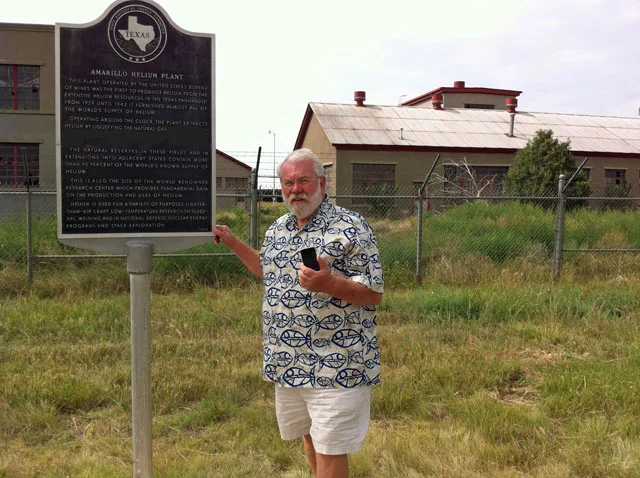 Here I'm standing in front of the Abandoned Amarillo Helium Plant. The plant was operated by the US Bureau of Mines and produced almost all of the world's helium from 1929 to 1943. The region surrounding the plant contains more than 95% of the world's known supply of helium. The helium exists (mixed with other gases trapped underground. This area is a heavy producer of natural gas (among others).