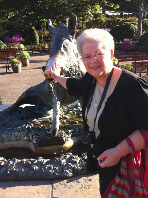 Pam with boar statue by Pietro Tacca at Butchart Gardens, Victoria, BC. And … the site of a geocache too!