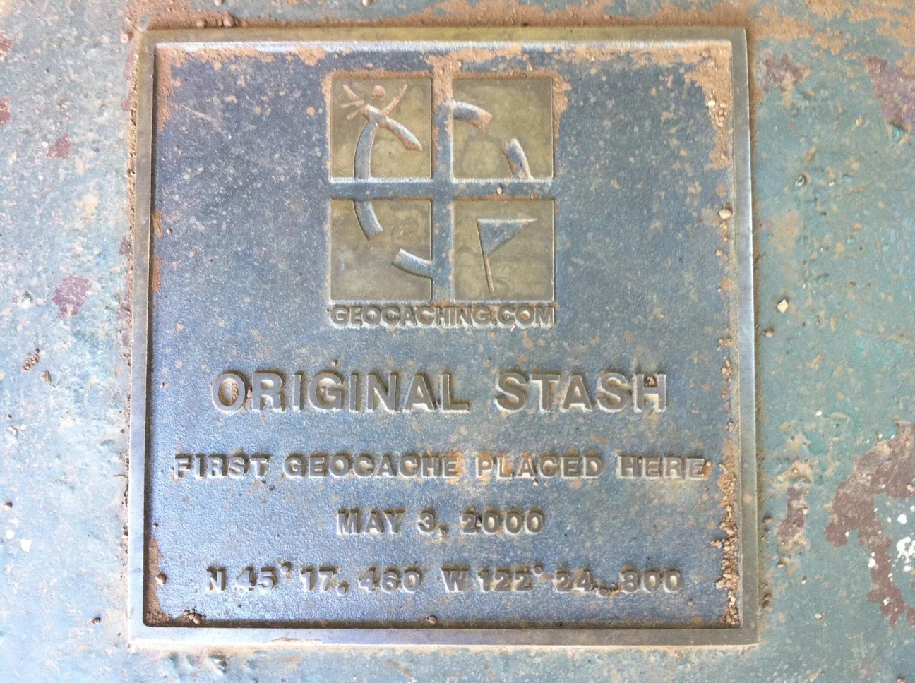 Plaque commemorating the location of the very first geocache in the world. Beavercreek, Oregon.